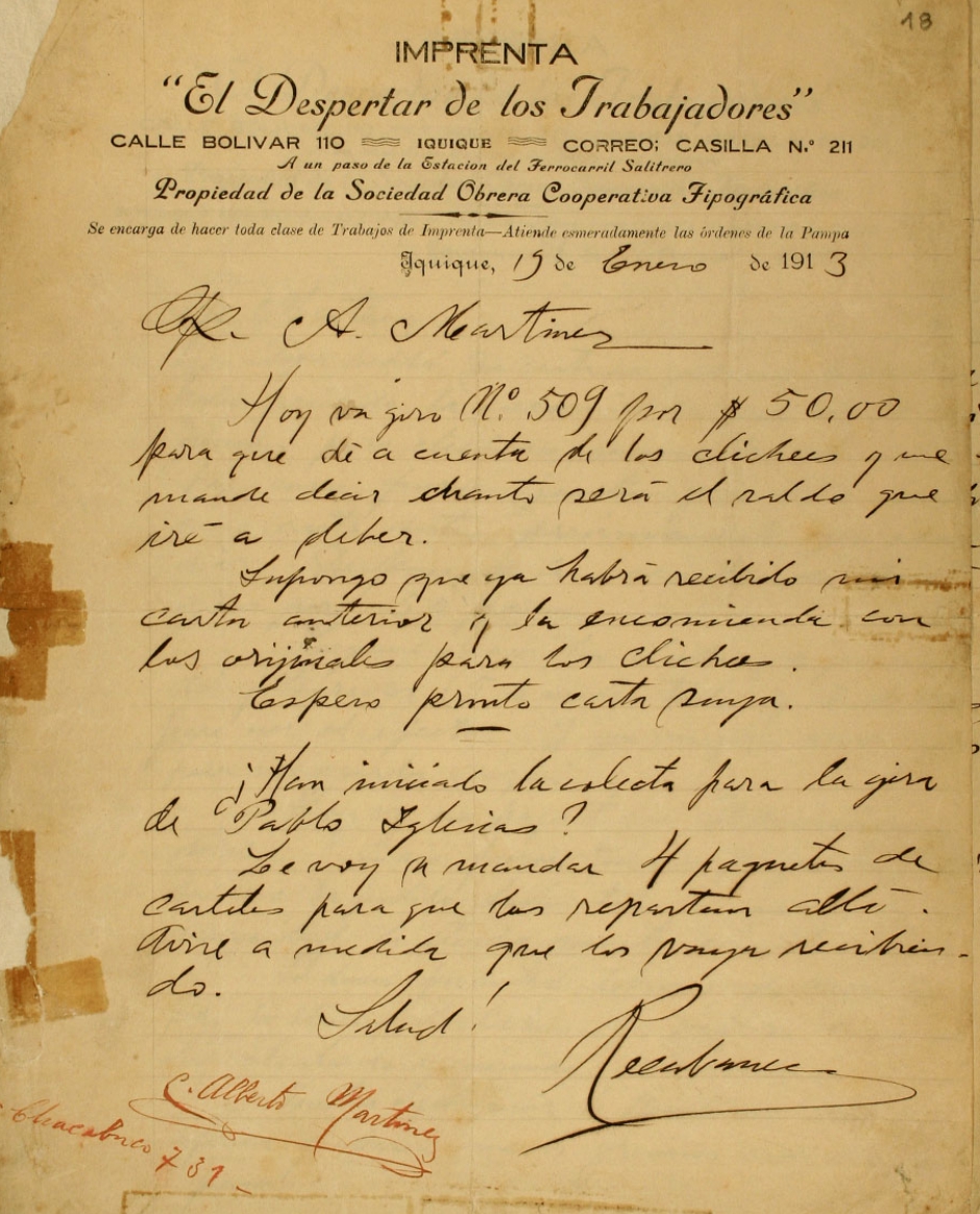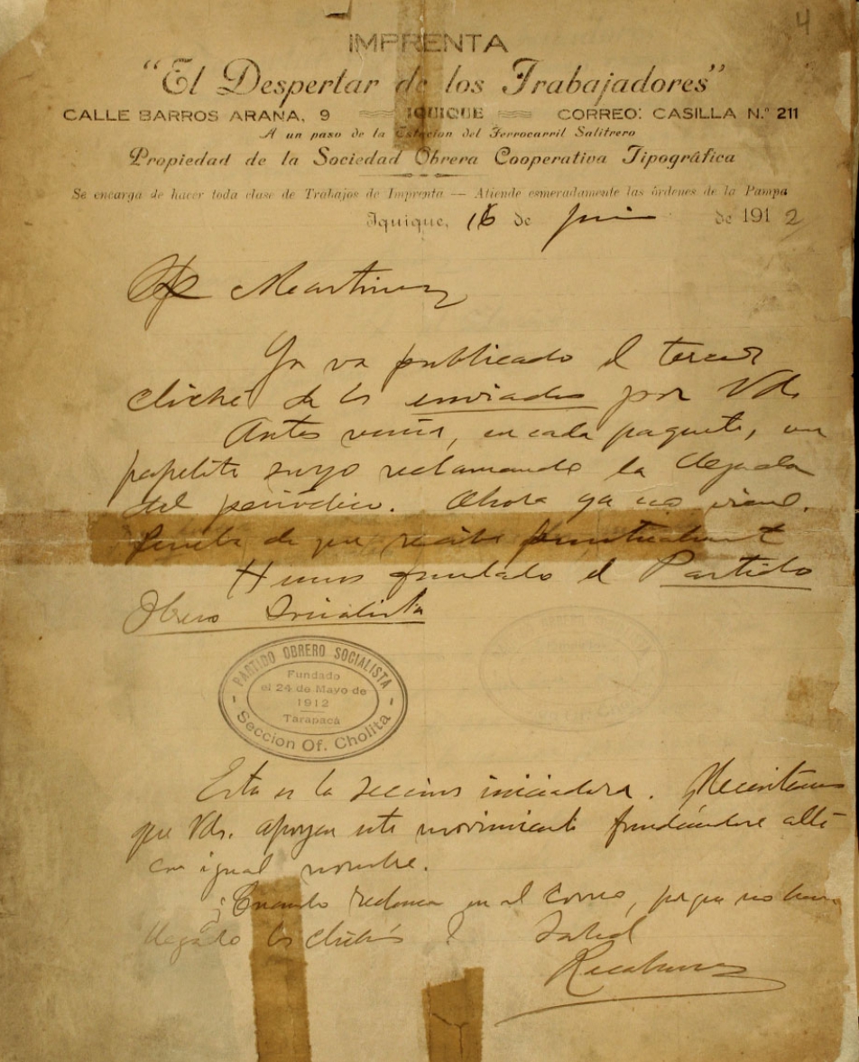 También comentaba artículos de prensa y la contingencia del movimiento obrero, solicitaba que le hiciera llegar prensa de provincia y le comentaba sus próximos proyectos.