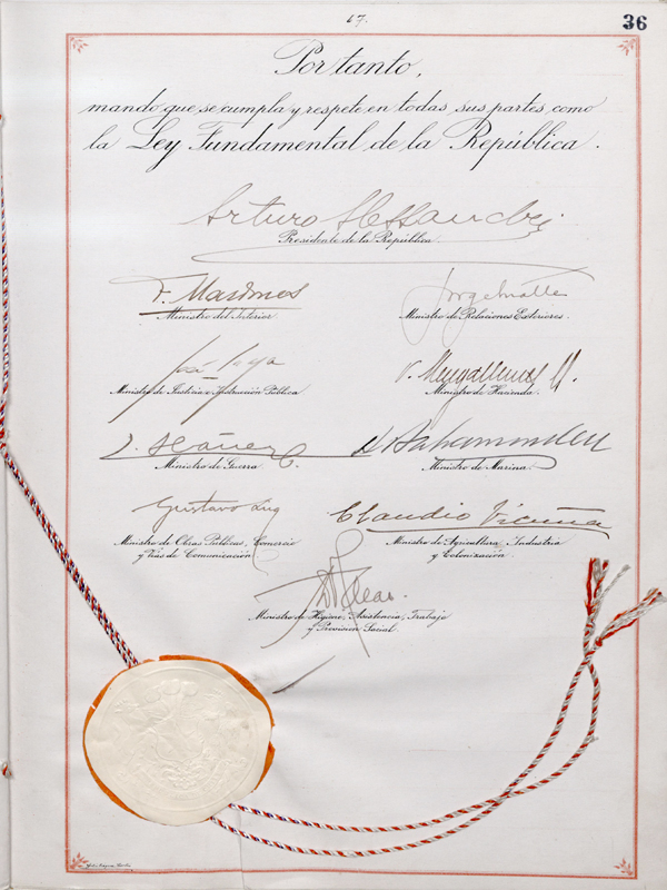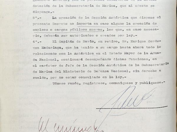 Decreto Nº 754, 8 de mayo de 1947 que establece la Sección Antártica dependiente de la Subsecretaría de Marina, dependencia encargada de la administración de la Base Naval Antártica Capitán Arturo Prat, inaugurada el 06 de febrero de 1947. Archivo Nacional de la Administración.