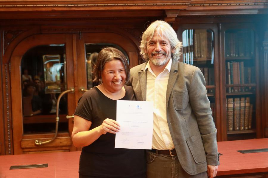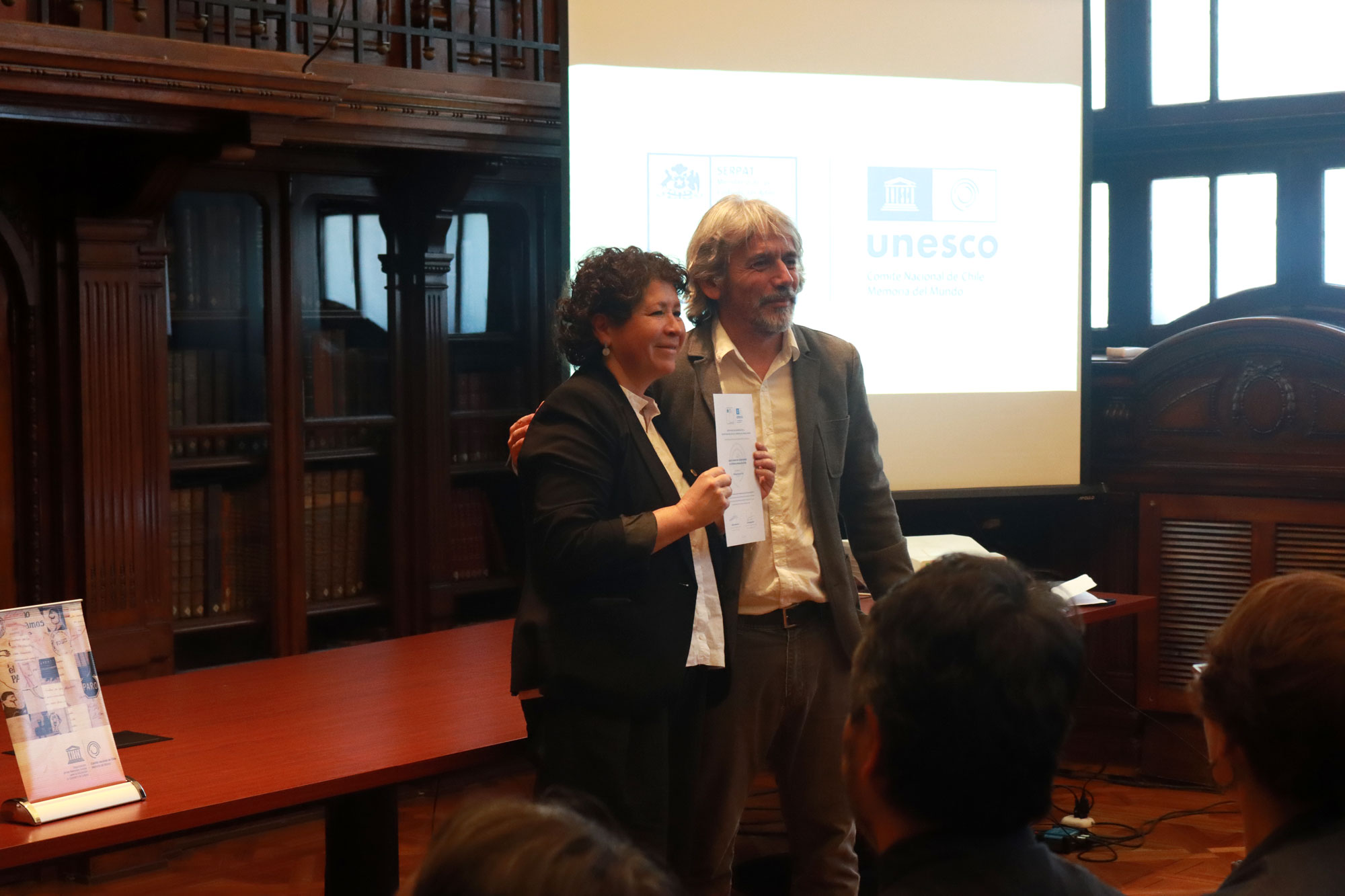 La directora del Archivo Nacional, Patricia Huenuqueo, recibió el certificado que acredita esta nominación de manos Rodrigo Sandoval, presidente del Comité Nacional de Chile de Memoria del Mundo - UNESCO.