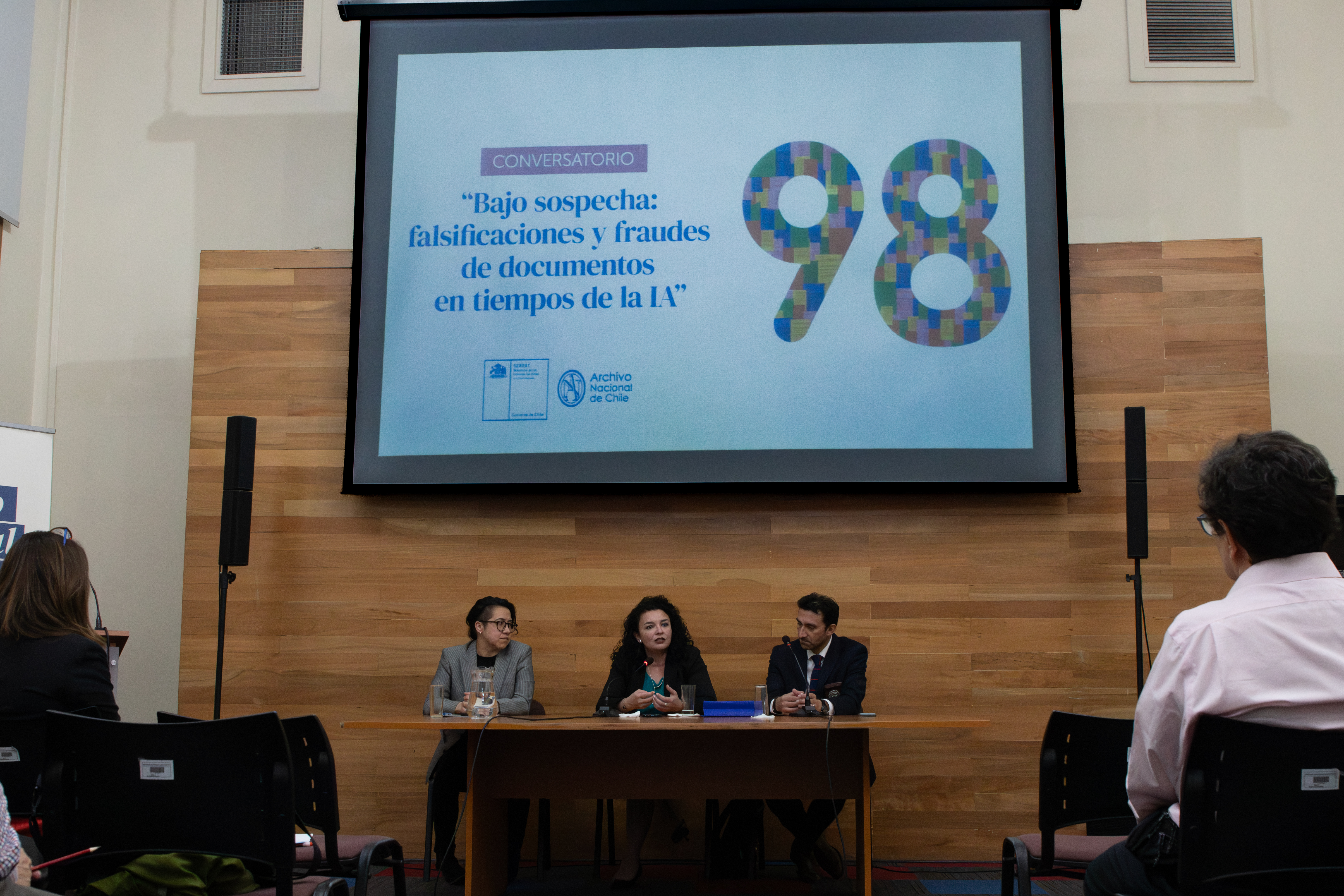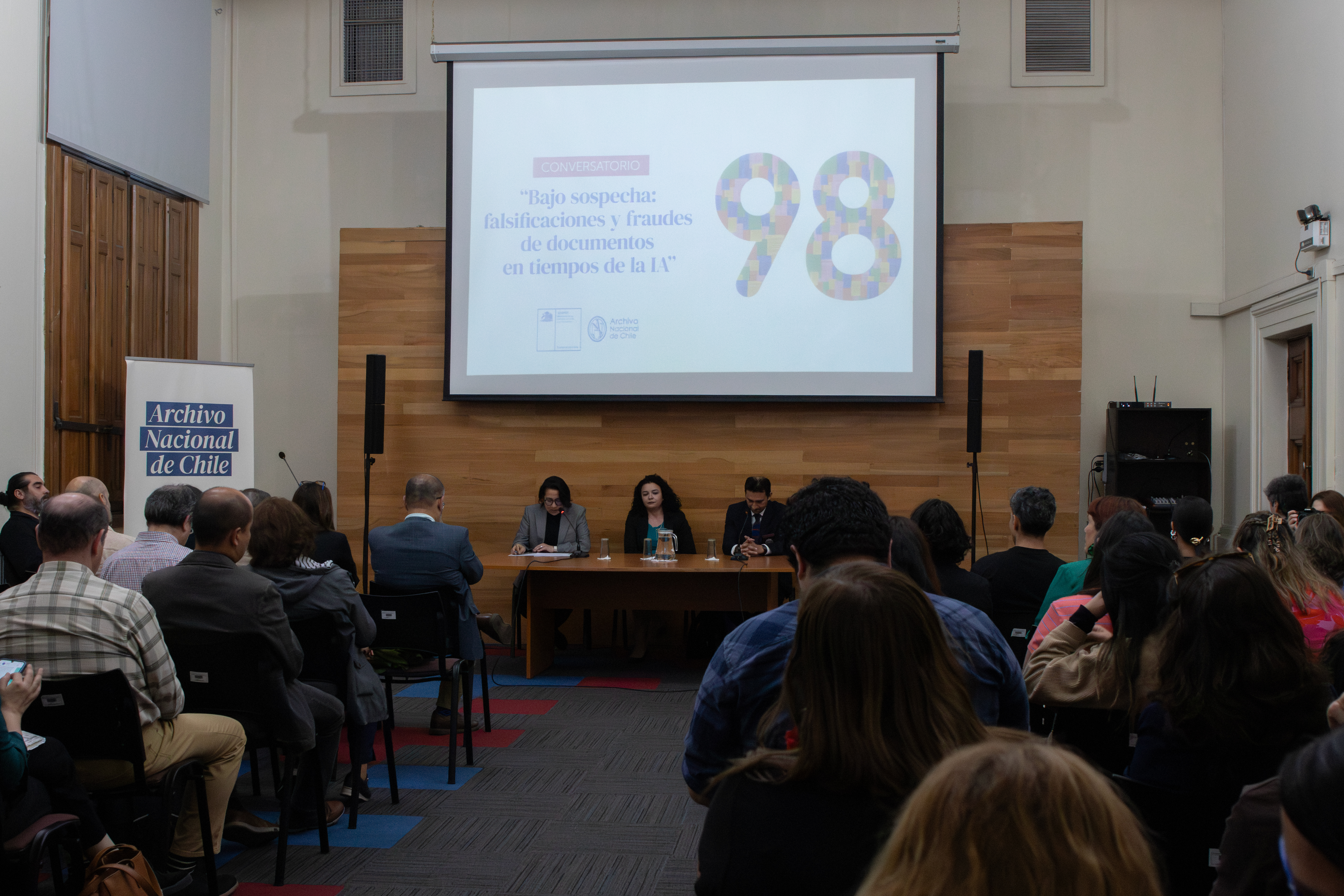 En un concurrido Salón Ricardo Donoso, el Archivo Nacional (AN) llevó a cabo el conversatorio titulado “Bajo sospecha: falsificaciones y fraudes de documentos en tiempos de la IA”, en el marco de la celebración de sus 98 años de existencia.