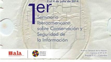 La Asociación Latinoamericana de Archivos -ALA y el Archivo General de la Nación de Colombia -AGN realizan en el marco de la XVI Reunión del Comité Intergubernamental Iberarchivos -Programa ADAI, el Primer Seminario Iberoamericano sobre Conservación y Seguridad de la Información, del 2 al 4 de julio de 2014, en el Archivo General de la Nación, en Bogotá, Colombia.