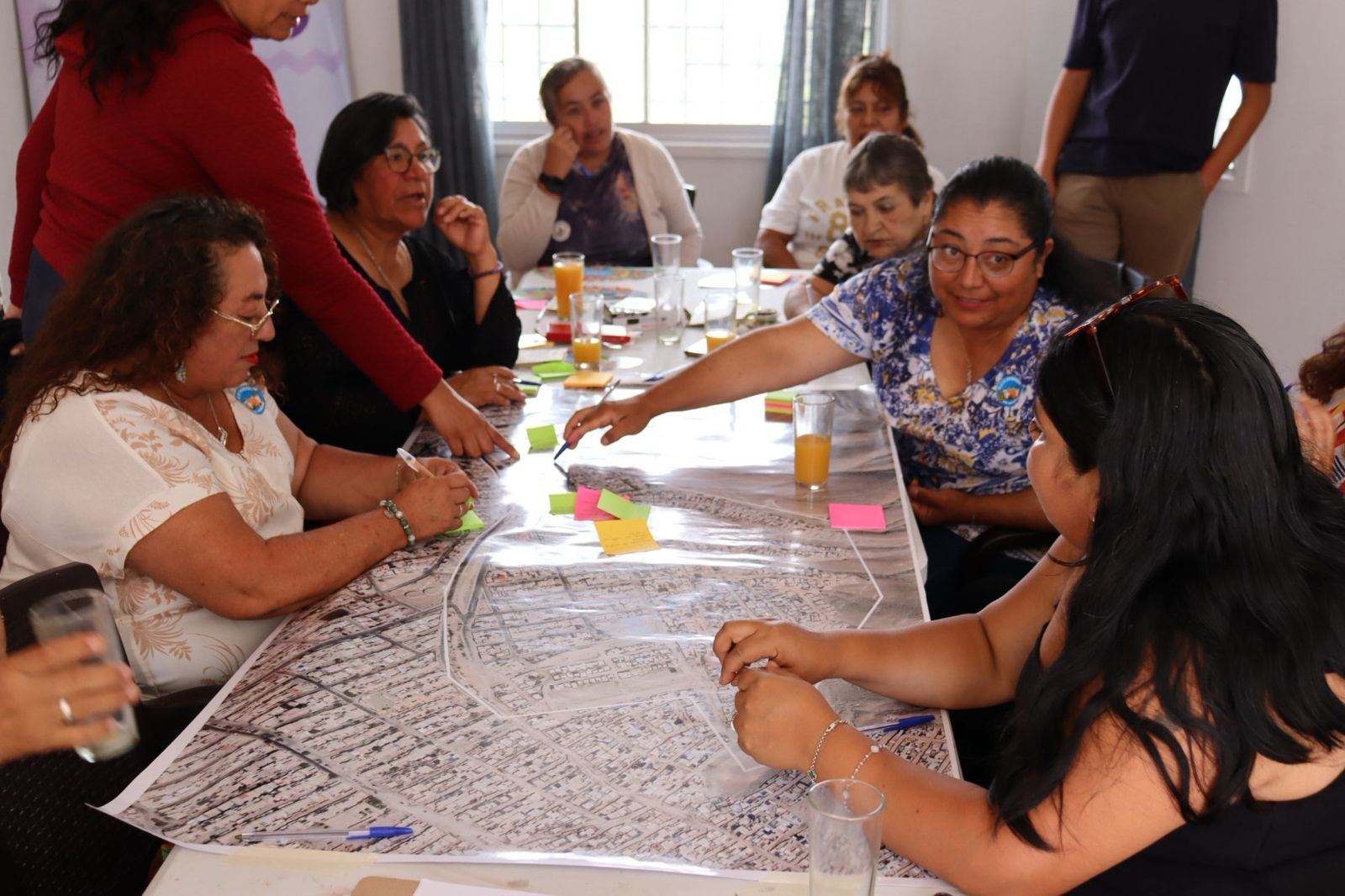 De esta manera, las y los vecinos pudieron reconstruir parte de su historia, en una primera sesión que estuvo focalizada en lo que fueron los inicios del barrio a finales de los años 80, trabajo realizado sobre un mapa que permitió ir identificando hitos, lugares importantes para sus habitantes y el crecimiento urbano de la población desde los relatos de quienes estuvieron presentes.