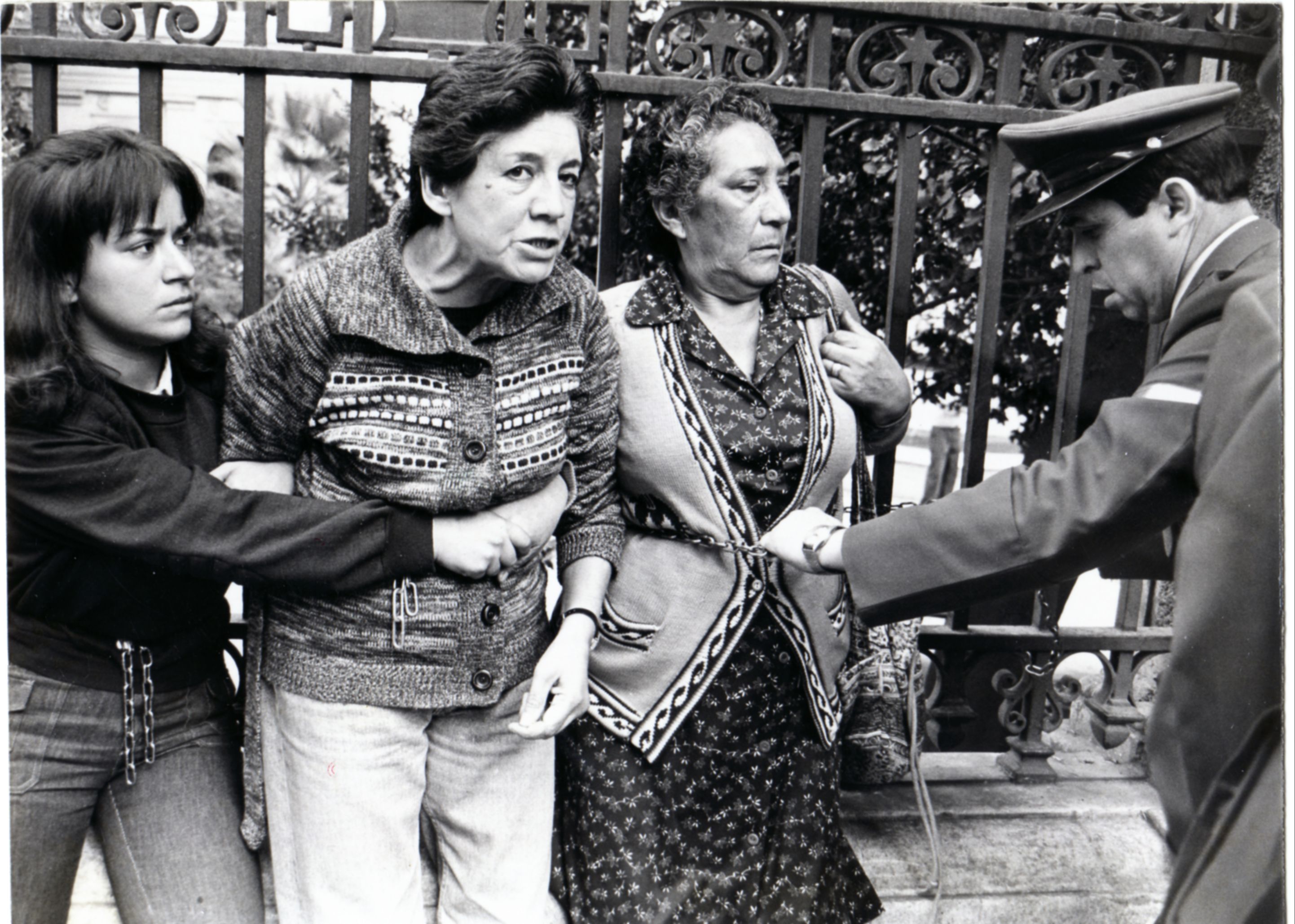 Foto C: Carabineros junto a grupo de mujeres encadenadas en las rejas del ex Congreso Nacional, como protesta por la libertad de los presos políticos. Fondo Fortín Mapocho, Archivo Nacional de la Administración: CL ARNAD AD-10-FFMAP-S56-FOT/FM B (00864).