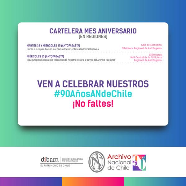 Además, en Antofagasta realizará, el 14 y 15 de noviembre, el curso de capacitación “Archivos documentales y administrativos”, en la Sala de Extensión de la Biblioteca Regional. En este mismo espacio expondrá una muestra con más de 30 reproducciones de algunos de sus documentos históricos, bajo el título “Recorriendo nuestra historia a través del Archivo Nacional”.